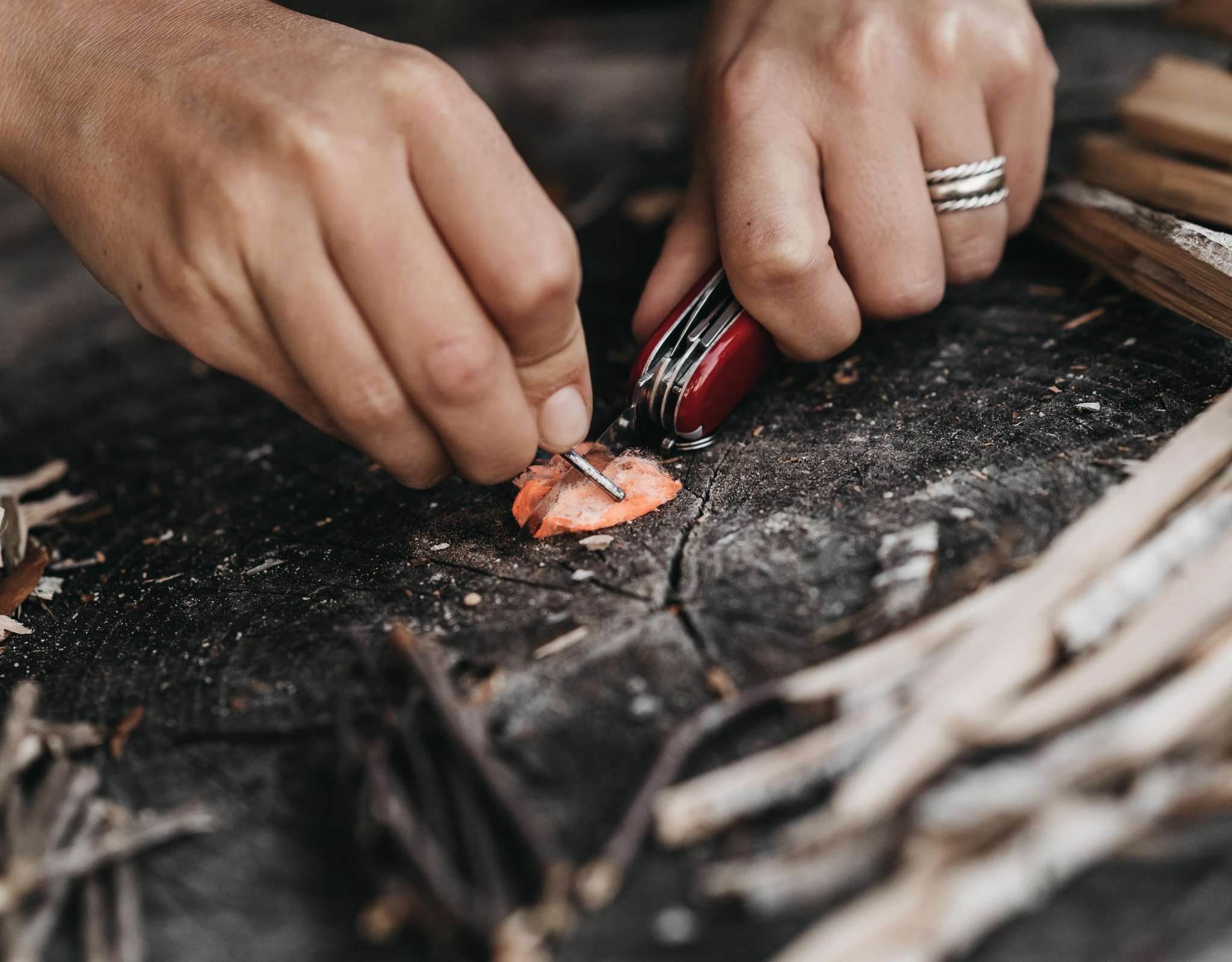 • Met lucifers, tindersticks of een firesteel is vuur maken kinderspel. Heb je die niet bij de hand? Creëer dan een kortsluiting in een batterij door de minpool met de pluspool te verbinden met de hulp van een aluminiumpapiertje (zoals een kauwgumpapiertje). Een paar vonken volstaan om het droge kreupelhout aan het branden te krijgen.