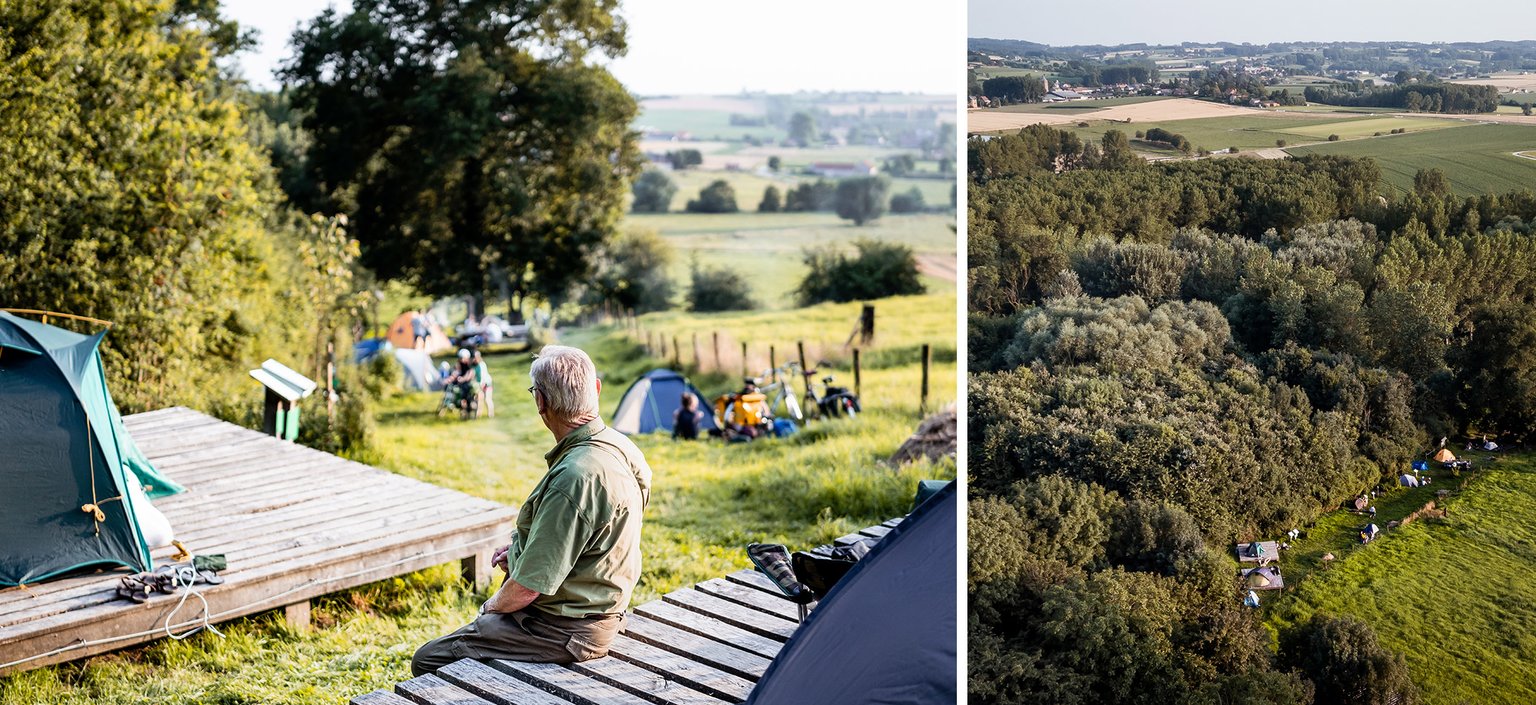 Valavond op een idyllische heuvel in de Vlaamse Ardennen. Aan het einde van een kasseistrook, zo eentje waarop zelfs de stoerste flandriens en flandriennes om hun moeder roepen, wacht een malse strook gras aan de bosrand. Hikers zetten hun tenten op - doodmoe, maar gelukkig - na een lange dag op en af in het decor van Vlaanderens Mooiste. Bikepackers en toerfietsers ploffen neer om uit te hijgen van de laatste inspanning. De ene is die ochtend in Brugge vertrokken, de andere in Antwerpen, een derde ergens in Nederland. Op deze heuvelflank in Horebeke kruisen al die lijnen elkaar. Bij een postkaartuitzicht over akkers en weilanden verbroederen hikers en fietsers en delen ze hun ervaringen van die dag.