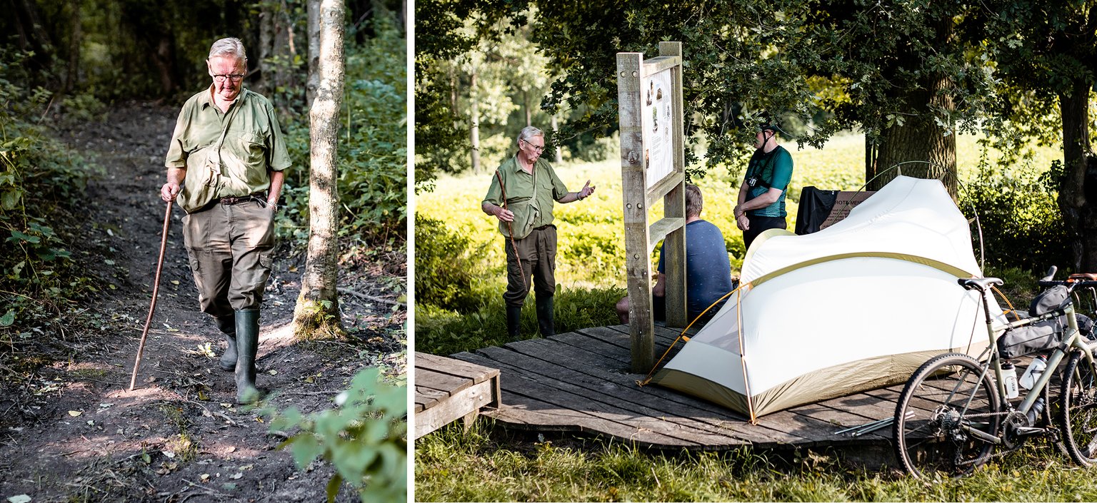 Raoul D’Hoossche (74) uit Oudenaarde aanschouwt het tafereel met een glimlach. “Jij bent een goeie gast”, werpen de fietsers uit Brugge met lof. “Het is hier prachtig.” Raoul glimt van trots. Hiervoor doet hij het. Hij is de eigenaar van Bivakzone Wereldboom, de enige bivakzone in de Vlaamse Ardennen. Het enige plekje in de wijde omtrek waar trage reizigers hun uitgeputte lijven een nachtje gratis te rusten mogen leggen. En niet alleen dat: ook het aangrenzende lapje natuur stelt Raoul open voor bezoekers.