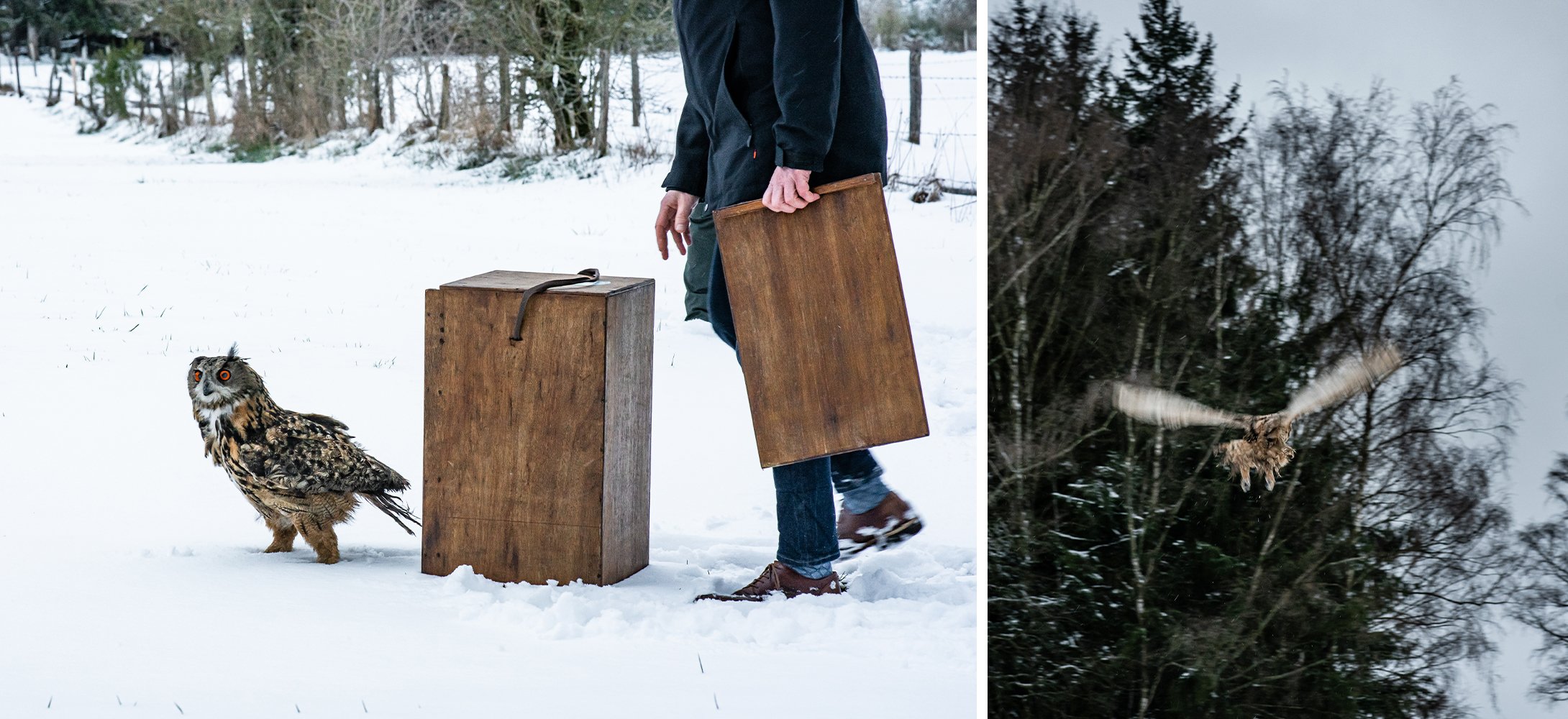 Het was Marcel die eigenhandig de herstelde oehoe ving met een schepzak en in een zelfgemaakte transportbox stopte. Tijdens de onverwachte winterprik van begin april reden twee vrijwilligers met Heidi naar Sankt-Vith. Er lagen die dag centimeters sneeuw in de Oostkantons. “Niemand kon dat weer voorspellen”, zegt Marcel. “Maar zo’n beest trekt zijn plan. Ze werd bewust vrijgelaten in die regio, omdat ze daar veel meer prooi kan pakken. Ik ben er bijna zeker van ze zich zal redden.”