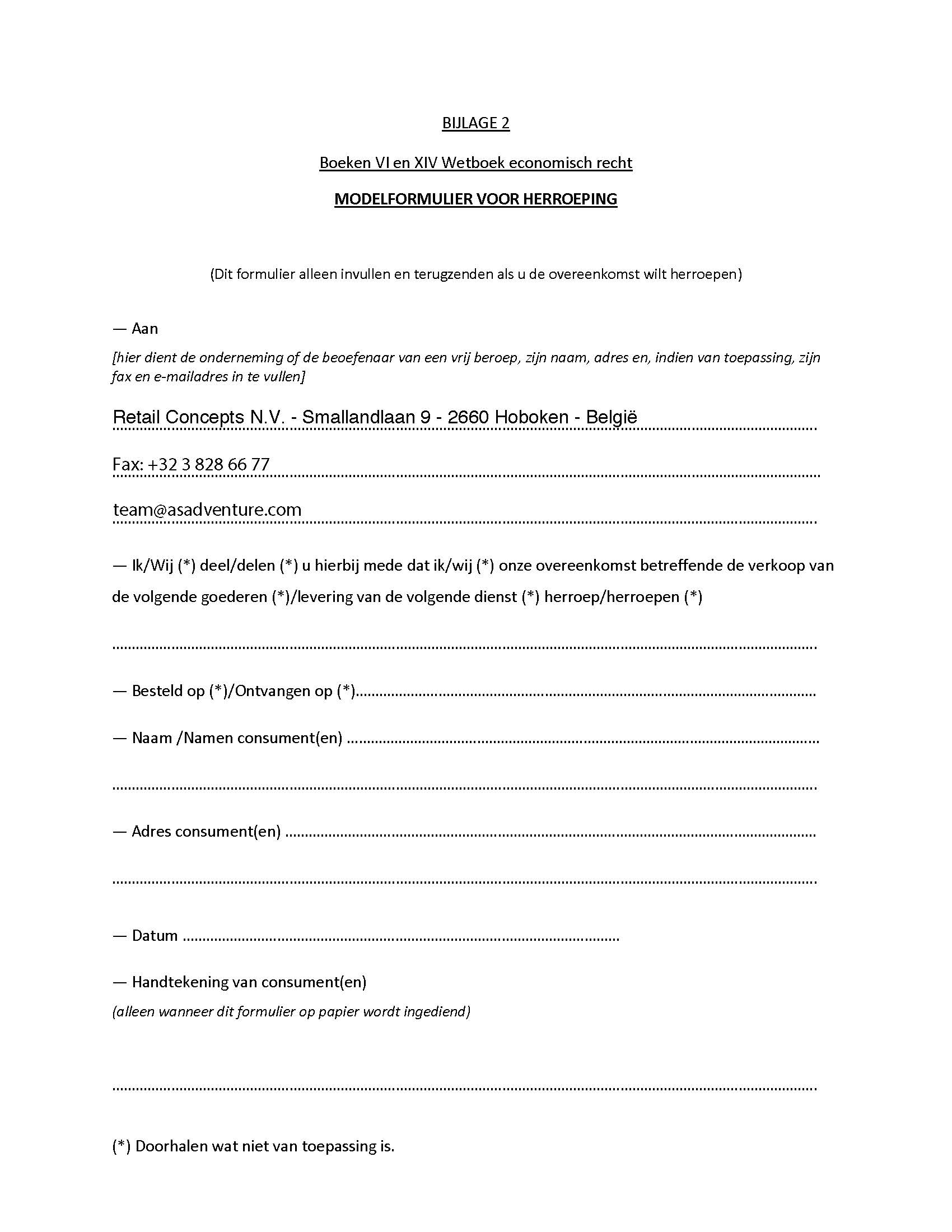 Om het herroepingsrecht uit te oefenen, moet u ons Retail concepts N.V., Smallandlaan 9, 2660 Hoboken, +32 828 30 15, mail via een duidelijke en specifieke verklaring (bij voorkeur via e-mail of schriftelijk per post) op de hoogte stellen van uw beslissing om de overeenkomst te herroepen. Als consument dien je de kennisgeving te kunnen bewijzen indien nodig. Om de herroepingstermijn na te leven volstaat het om uw mededeling betreffende uw uitoefening van het herroepingsrecht te verzenden voordat de herroepingstermijn is verstreken.